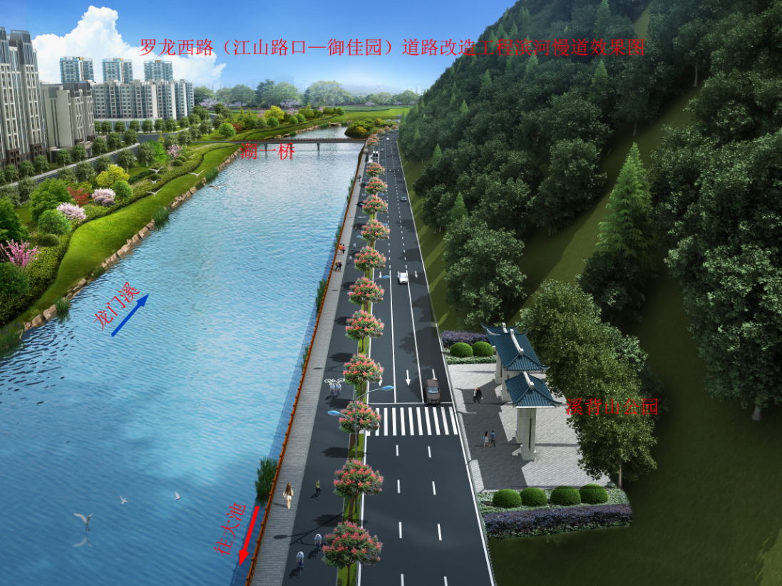 羅龍西路是連接龍巖西高速出入口與中心城市的唯一通道,其規(guī)劃改造范圍從紅竹山橋至御佳園路口,全長3855米,計劃將原道路拓寬至40米,實行雙向六車道,兩旁設(shè)2.5米非機(jī)動車道,并在湖二橋路口以東設(shè)640米入城單向三車道隧道連接至御佳園路口,原羅龍西路湖二橋至御佳園段將調(diào)整為出城單向車道。