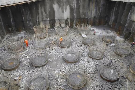 8月24日,繼龍巖大道高架橋主橋主塔樁基、承臺(tái)基坑開挖完成后項(xiàng)目已進(jìn)入主塔承臺(tái)施工階段,主橋封底混凝土澆筑完成0.75米(共1.5米),主橋轉(zhuǎn)體關(guān)鍵設(shè)備鑄鋼球鉸已生產(chǎn)完成,現(xiàn)場(chǎng)正進(jìn)行樁頭破除作業(yè)。由于連續(xù)橫跨贛龍鐵路、龍廈鐵路、羅龍東路、龍津河、雙洋路,主橋采用不對(duì)稱跨塔梁同時(shí)轉(zhuǎn)體施工,其轉(zhuǎn)體總重達(dá)2.366萬(wàn)噸,轉(zhuǎn)體懸臂173.75m,施工難度巨大。為避免對(duì)城市道路及鐵路運(yùn)行的影響,主橋?qū)⒉捎貌粚?duì)稱跨塔梁施工并分二次轉(zhuǎn)體,下一步進(jìn)行控制性工程為兩次主塔轉(zhuǎn)體施工。
