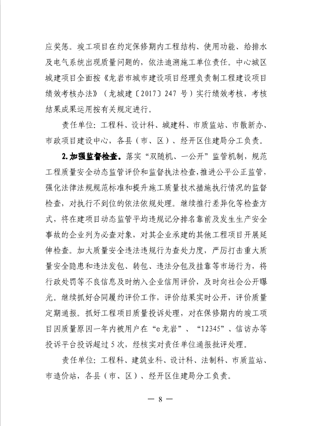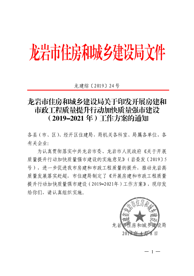 龍巖市住房和城鄉(xiāng)建設(shè)局關(guān)于印發(fā)開展房建和市政工程質(zhì)量提升行動加快質(zhì)量強市建設(shè)(2019-2021年)工作方案的通知