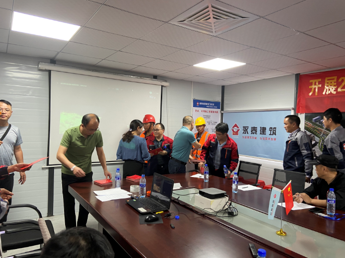 現(xiàn)場,副總經(jīng)理俞桃蓮、修海金及總經(jīng)理助理章志強向項目部人員及工人現(xiàn)場分發(fā)安全知識手冊、安全知識圖冊等宣傳資料。